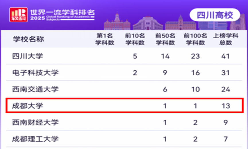成都大学13个学科上榜2025软科世界一流学科排名