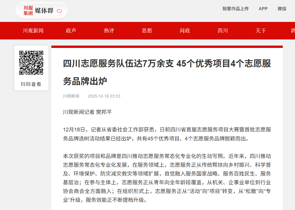 原文链接:四川志愿服务队伍达7万余支 45个优秀项目4个志愿服务品牌出炉 原文如下:12月18日,记者从省委社会工作部获悉,日前四川省首届志愿服务项目大赛暨首批志愿服务品牌选树活动结果已经出炉,共有45个优秀项目、4个志愿服务品牌脱颖而出。 本次获奖的项目和品牌是四川推动志愿服务常态化专业化的生动写照。近年来,四川推动志愿服务常态化专业化发展,在服务领域上,志愿服务正从传统帮扶向乡村振兴、科学普及、环境保护、防灾减灾救灾等领域扩展,自觉融入服务国家战略、服务百姓民生、服务基层治...